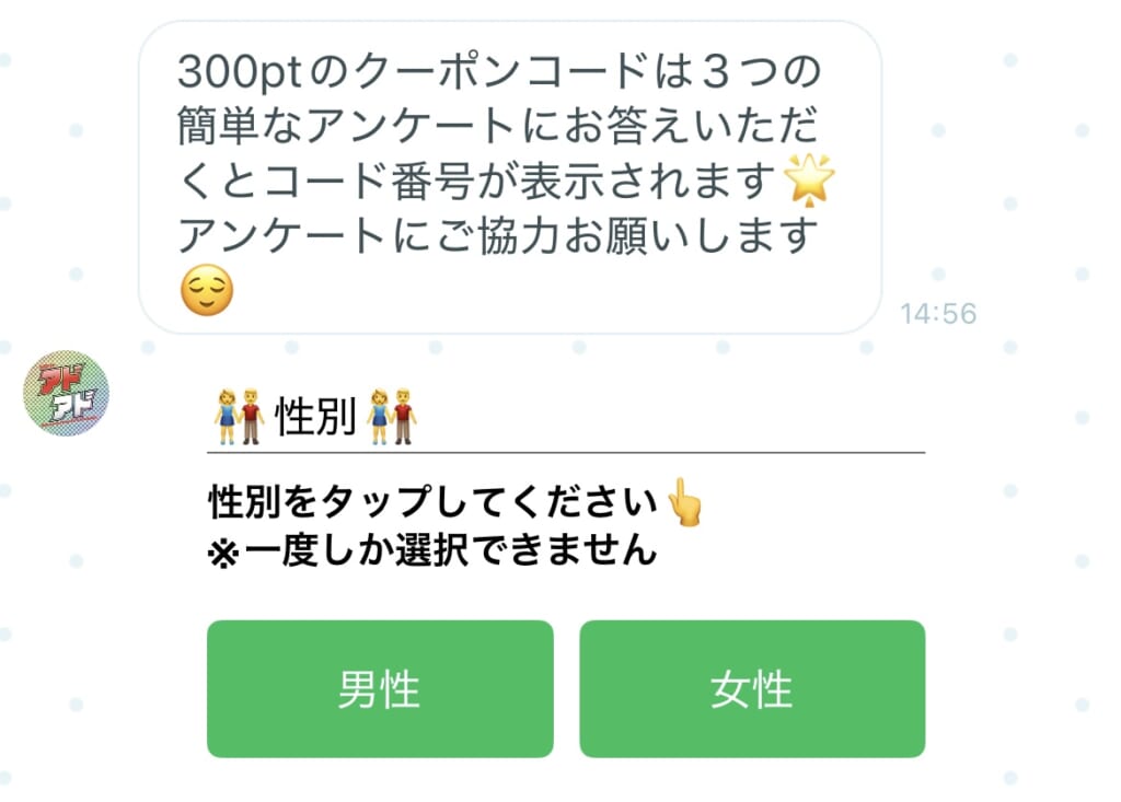 公式LINEでの無料クーポン配布も不定期の開催ですが、公式LINEのアンケートに答えれば、300ptのクーポンは必ずもらえます。
