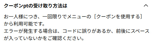 クーポンは原則1回までの利用で、種類によっては入力するだけでなく、ほかの利用条件が設けられている場合があります。