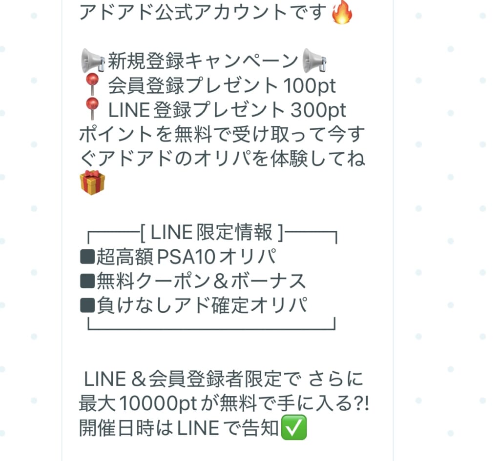 アドアドオリパ公式LINEでは、不定期で無料クーポンを配布しています。