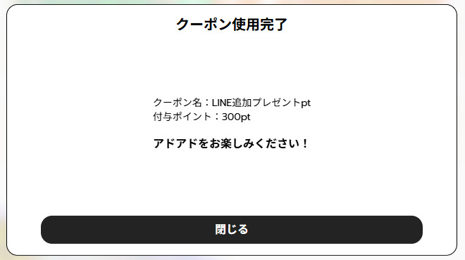 公式LINEで確実に入手できるクーポンコードとしては、300ptクーポンがあります。