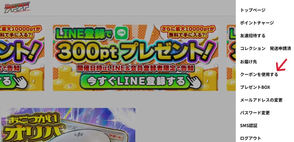 アドアドオリパのクーポンコードは、ログイン後のメニューから入力画面を表示して利用できます。