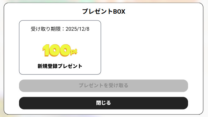 会員登録完了後、自動的に「プレゼントBOX」へ送られるため、期限までに受け取りましょう。