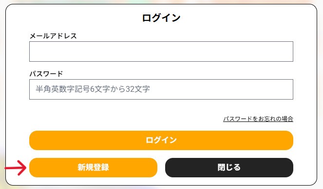 会員登録前にトップページへアクセスすると、右上に「ログイン/新規登録」が表示されているので、選択してログイン画面に移動します。
