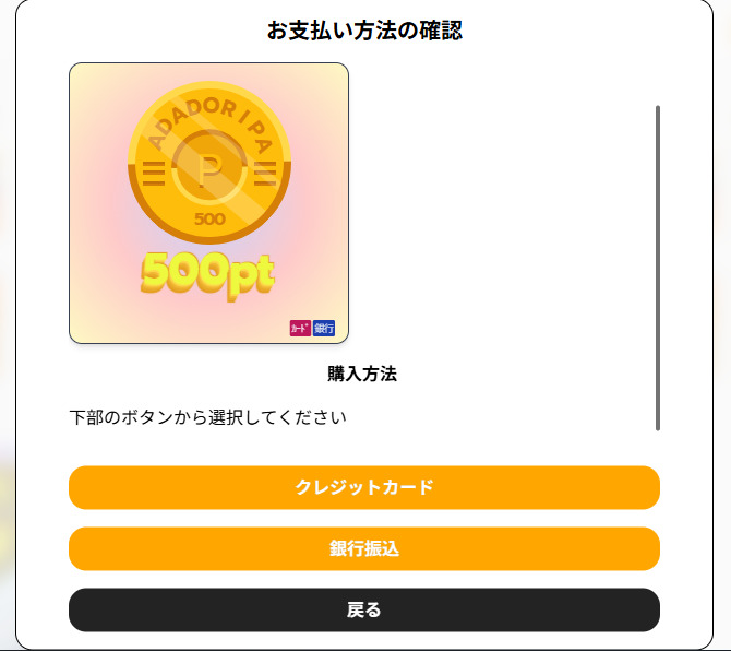 アドアドオリパのポイント購入時の支払い方法は、クレジットカードと銀行振込の2種類です。