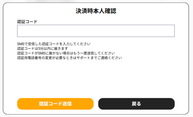支払い方法を選択すると、「決済時本人確認」として、SMS認証に認証コードが送信されます。