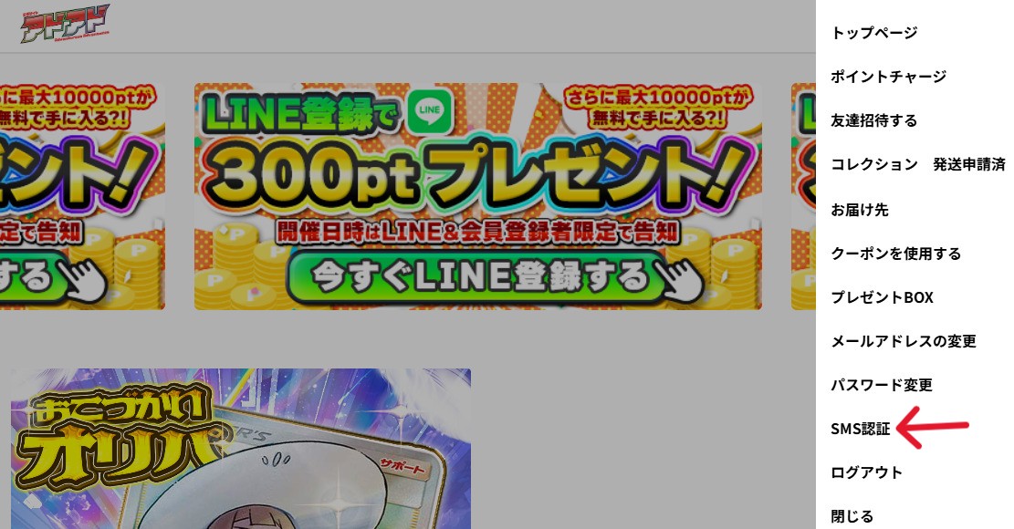 初回のポイント購入を行う場合、まずはメニューの「SMS認証」を選択します。