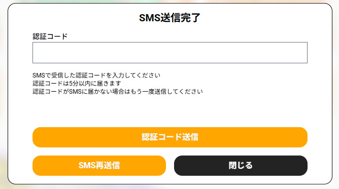 SMSに届いた認証コードを画面上に入力して、「認証コード送信」を選択しましょう。