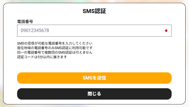 画面上にSMS認証の画面が表示されるため、送信先になる電話番号を入力しましょう。