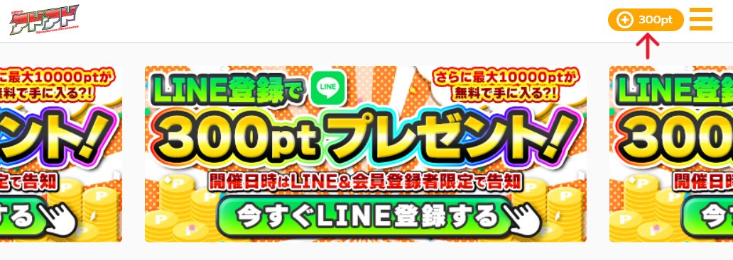 しかし、新規会員登録者に対しては、全員に配布される100ptやアドアドオリパ公式LINEの友だち追加直後の300ptクーポンが利用できます。