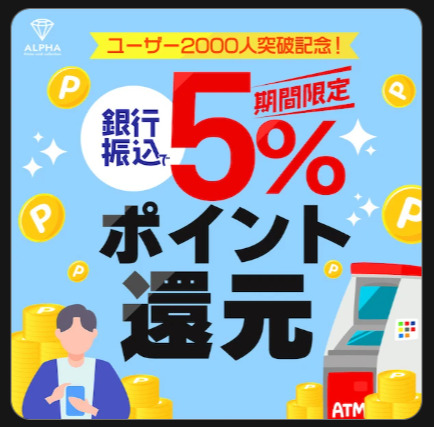 ALPHAオリパでは、支払い方法で銀行振込を選択した場合、課金額の5%がポイント還元されるキャンペーンを行っています。
