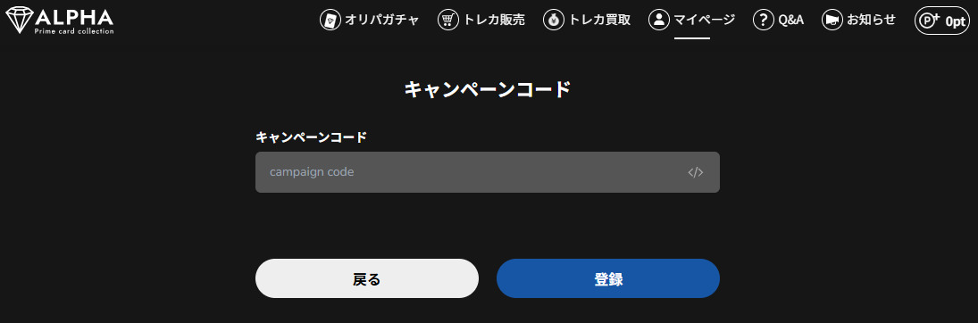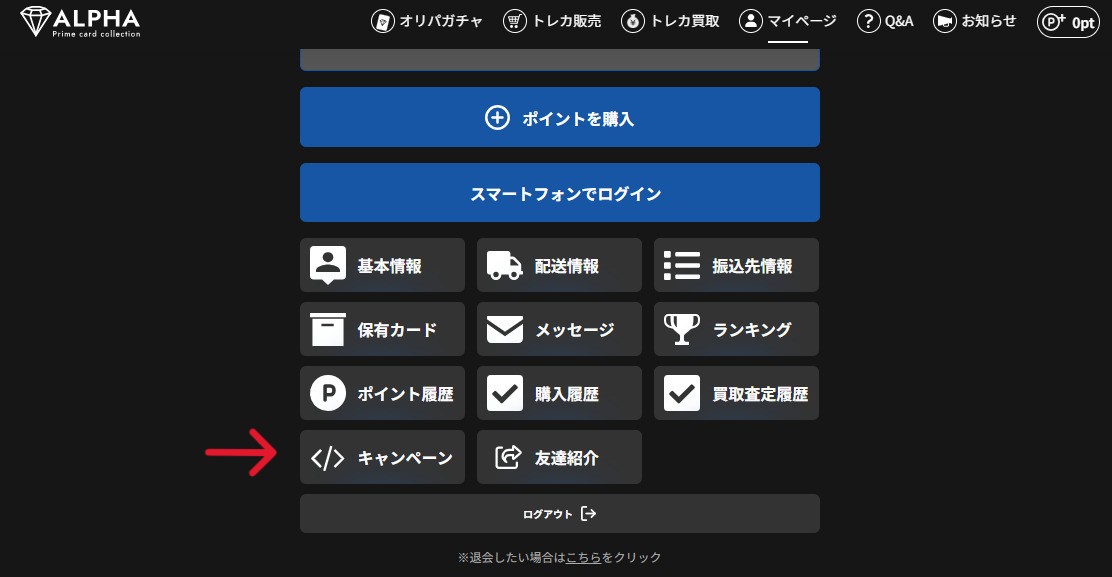 ALPHAオリパの既存会員がクーポンコードを利用する場合、マイページ内から「キャンペーン」を表示します。