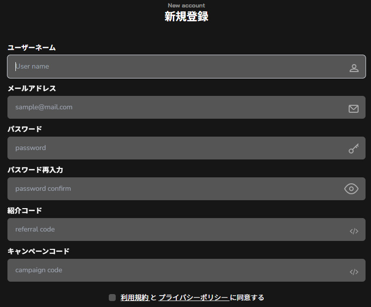新規登録画面の下部に「紹介コード」と「キャンペーンコード」の項目がそれぞれ用意されています。