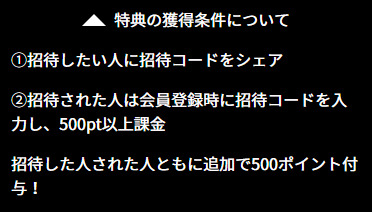 ALPHAオリパの招待コードは、新規会員登録時に入力して、500pt以上の課金した場合に入力者と紹介者の双方に500ptが付与されます。