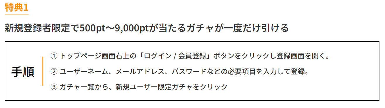 新規登録者限定で500pt〜9,000ptが当たるガチャが一度だけ引ける
