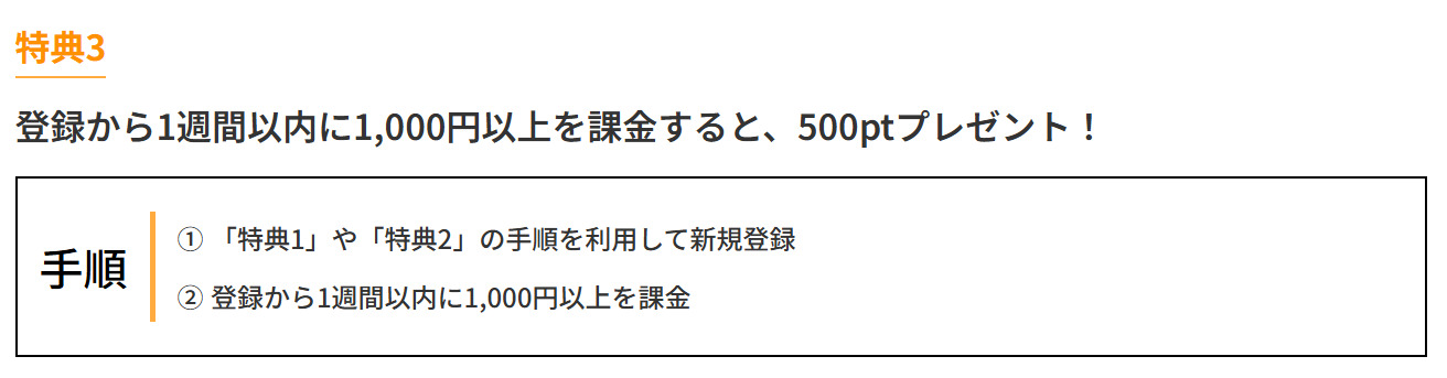 登録から1週間以内に1,000円以上を課金すると、500ptプレゼント!