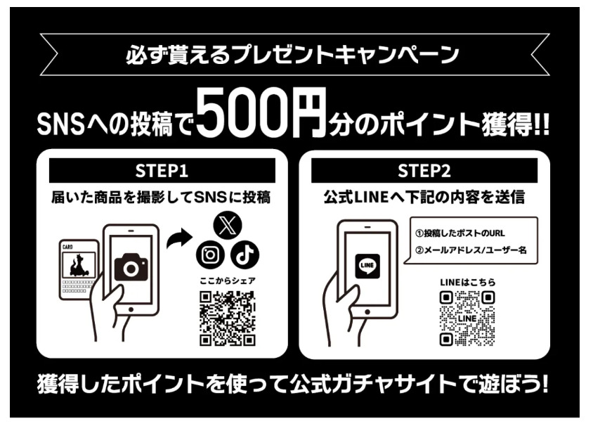 ALPHAオリパの当たった商品をSNSに投稿した場合、無料で必ず500ptがゲットできるキャンペーンを行っています。
