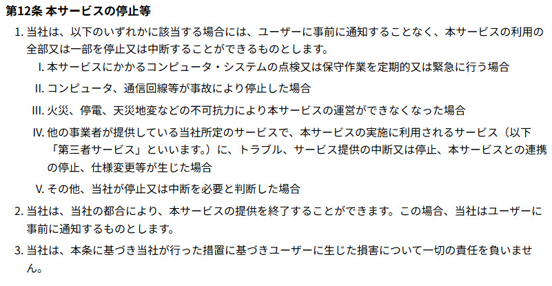 Cloveではクーポン配布を含めたサービスについて、利用者への事前通知なく停止、または中断できると利用規約に明記しています。