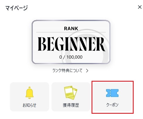 トップページ右上のアイコンからマイページを表示して「クーポン」から入力画面にアクセスできます。