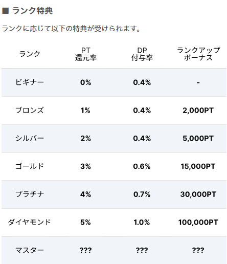 ログインボーナスが豪華になるほか、ポイント還元率やDP付与率が上がったり、ランクアップボーナスがもらえたりなどの特典もありますよ!