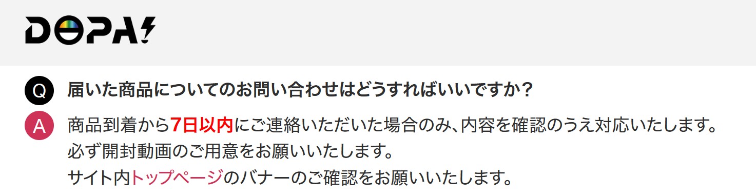 DOPAの発送は、「発送依頼から1~12日以内」となっています。