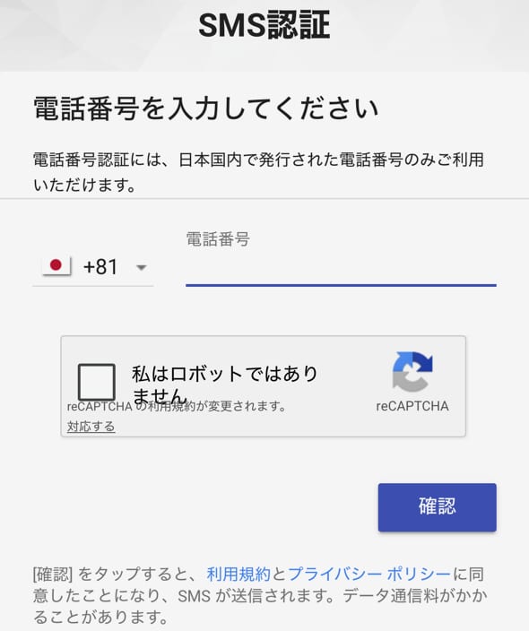 SMS認証を行う際は、正しい電話番号を入力してください。