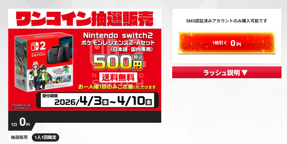 エクストレカでは、Switch2を500円で抽選販売するキャンペーンを行った実績があります。