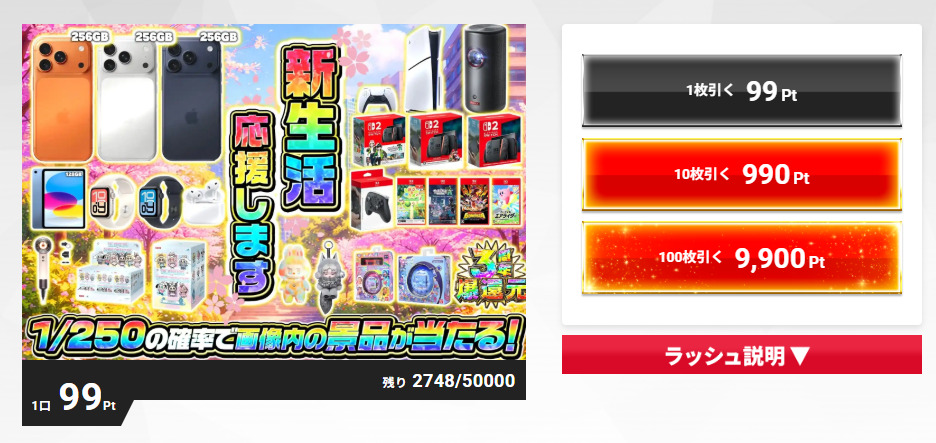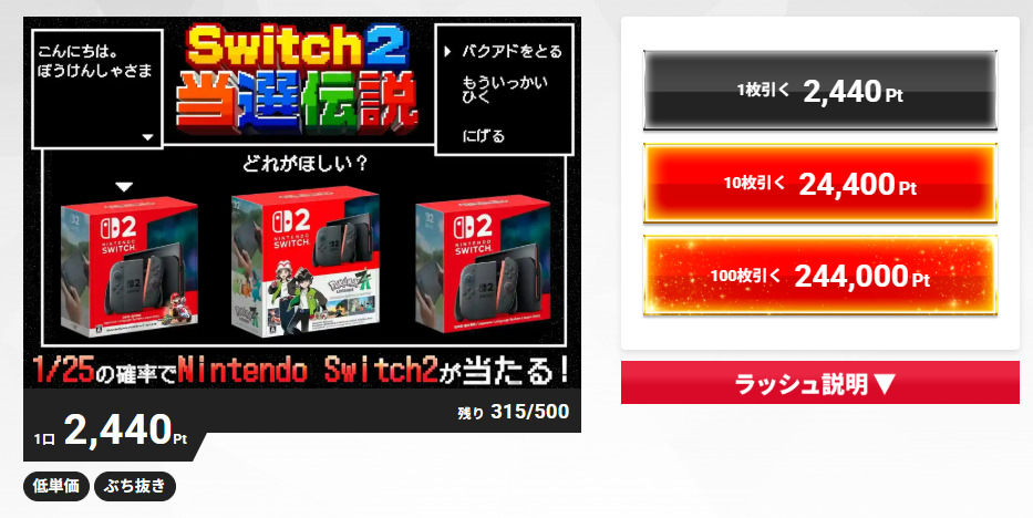 基本的には引くために必要なポイント数が高いほど、Switch2が当たる確率も高めに設定されます。