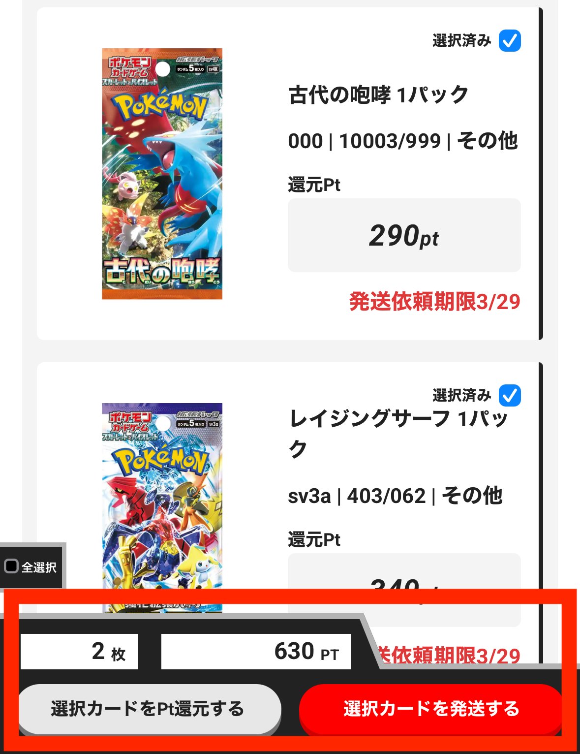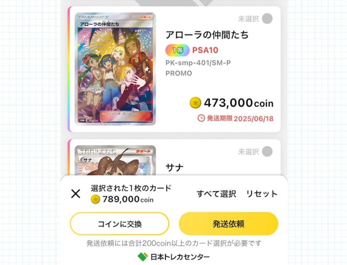 ゲットしたカードにも発送期限があり、発送申請のタイミングを逃すとカードが受け取れないこともあるので注意しましょう。