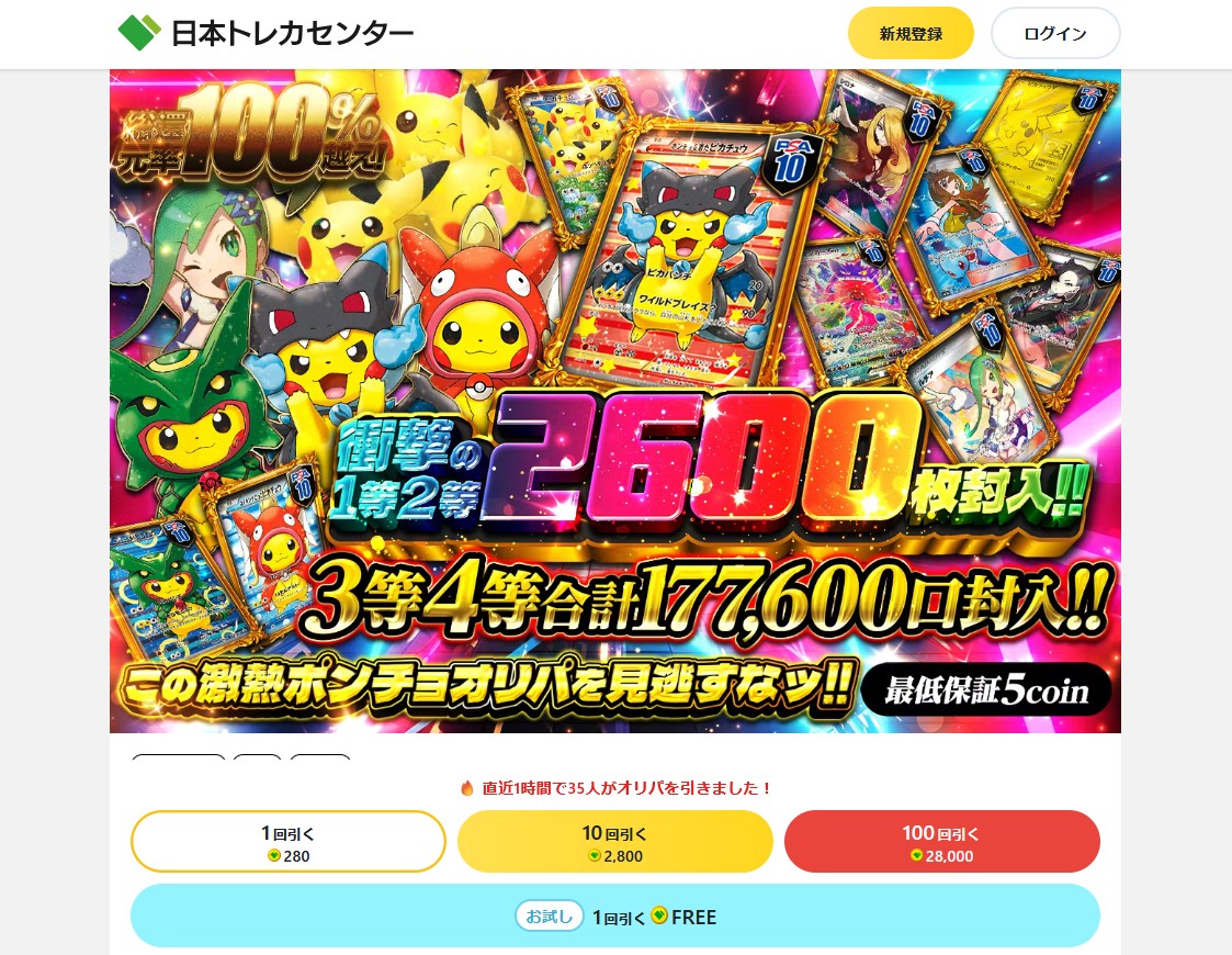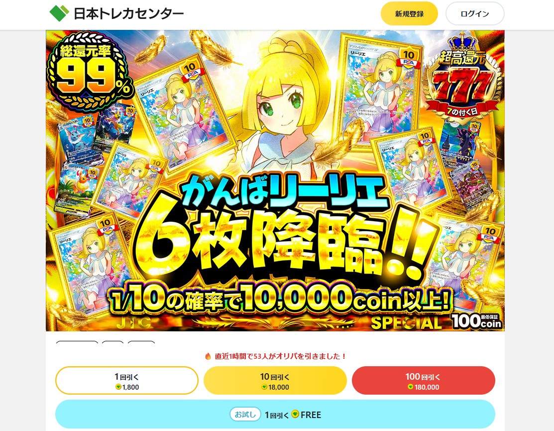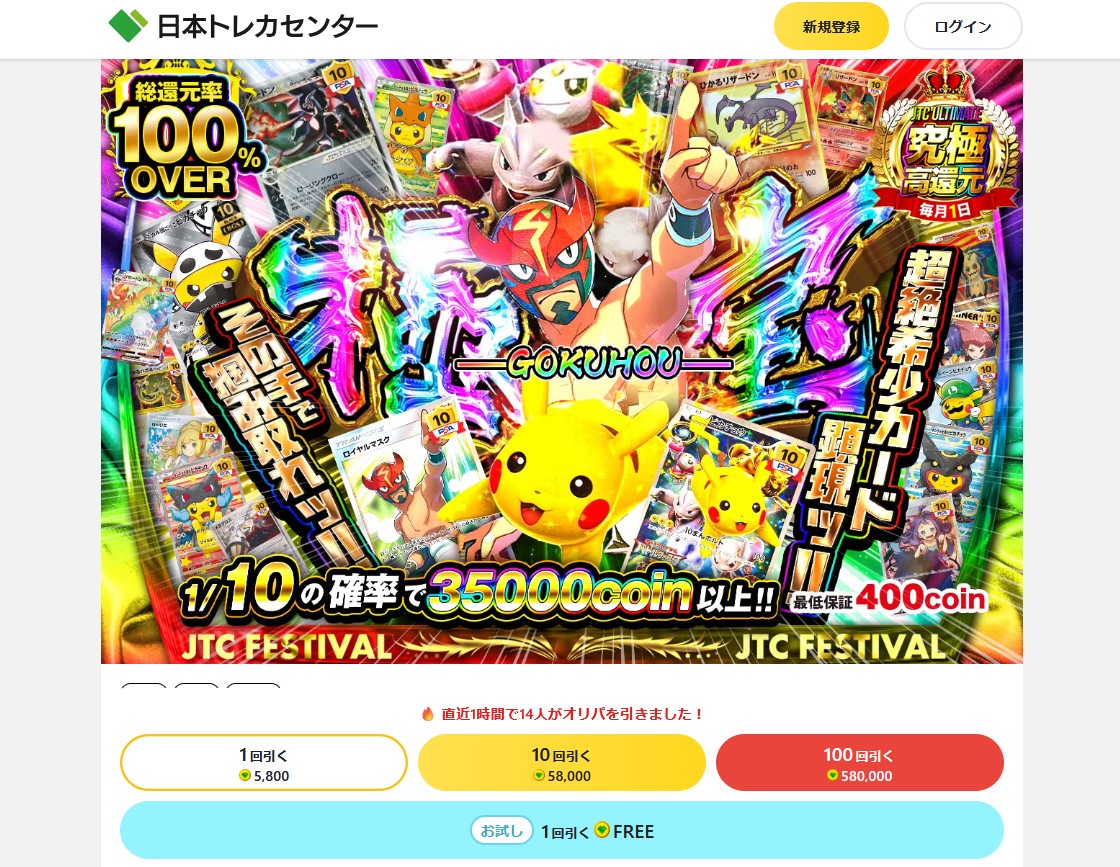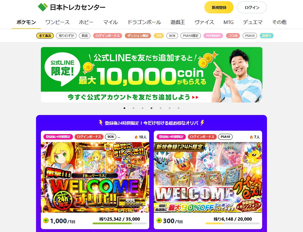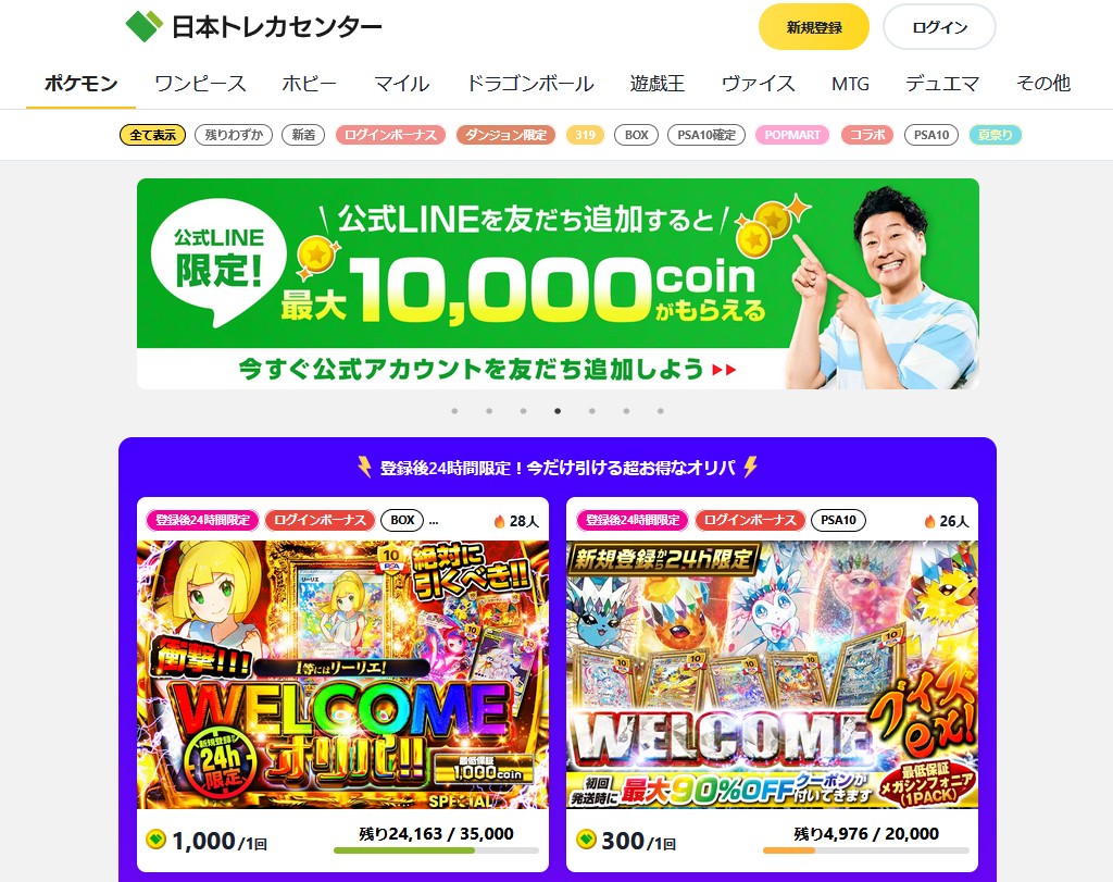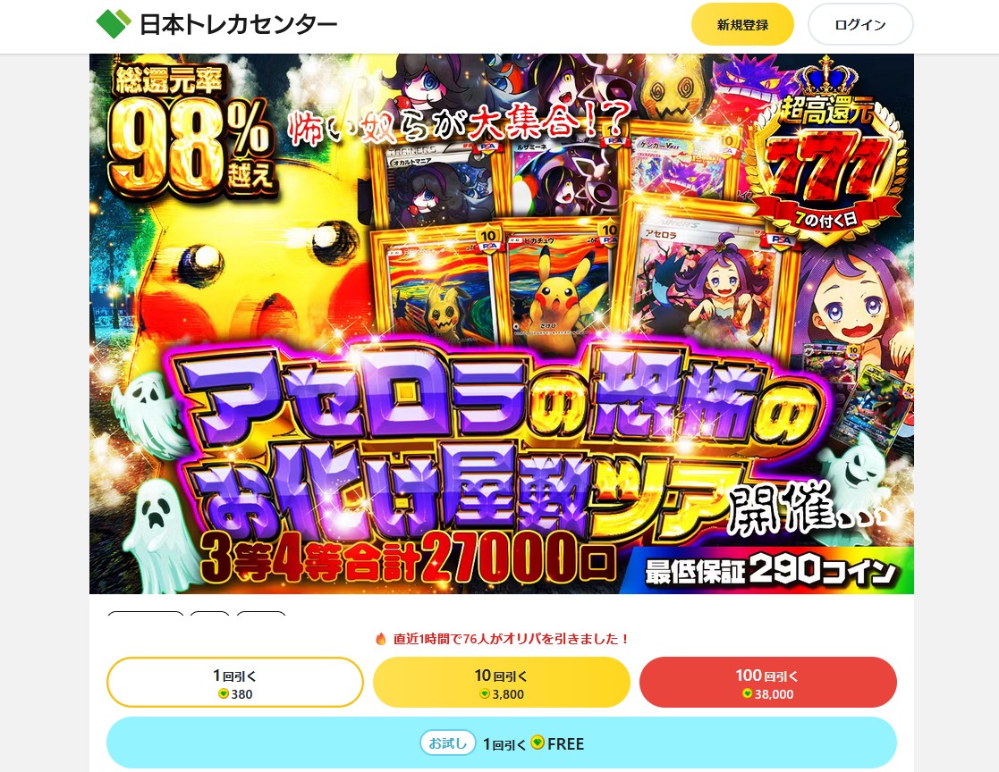 日本トレカセンターは、ポケモンカードや遊戯王、ワンピースなど、幅広いタイトルを取り扱っているオンラインオリパサイトです。