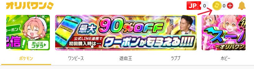 オリパワンでは、画面左上に所持コイン数が常に表示されています。