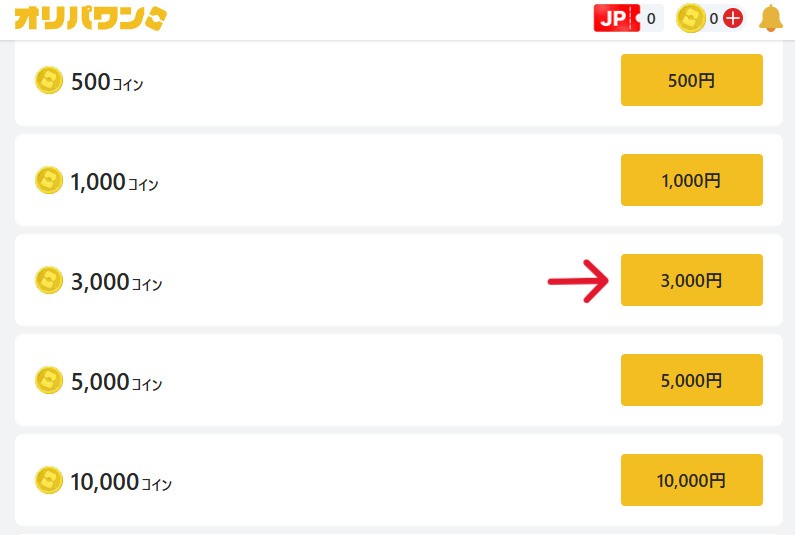コイン購入の選択画面が表示されるため、オリパワンの場合は3,000コイン以上から課金したい金額を選びましょう。