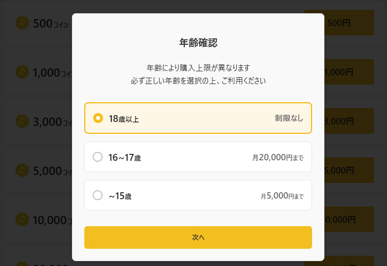 初回課金の場合は年齢確認で正しい年齢を選択する