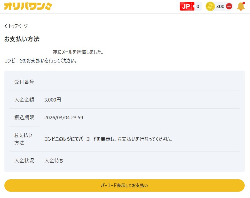 ここからは、オリパワンにおける手順を例にして、コンビニ払いのやり方を紹介します。
