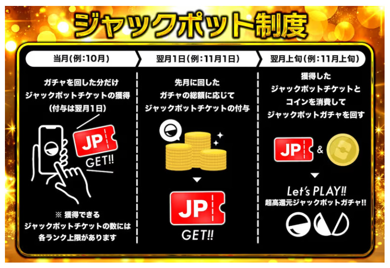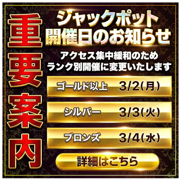 2026年3月からはサイトのアクセス集中を回避目的で、会員ランク別でジャックポットガチャの開催日が分けられました。