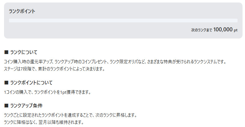 会員ランクはランクごとに昇格に必要なポイント数が設定されており、1コインの購入ごとに1ptずつ貯まっていきます。