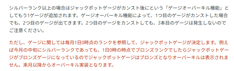 シルバーランクはブロンズランクから全体の特典内容が少し豪華になり、ジャックポットゲージにゲージオーバーキル機能が追加されます。