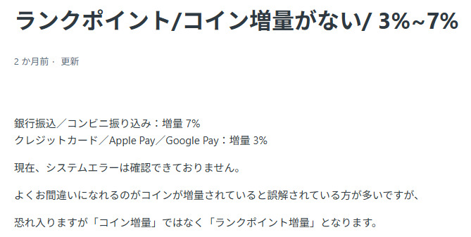 銀行振込・コンビニ払いが+7%と最もポイント付与率が高く、500円課金した場合は535ランクポイントが得られます。