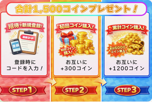 • 招待コードを入力して、課金すると最大1,500coinもらえる!
