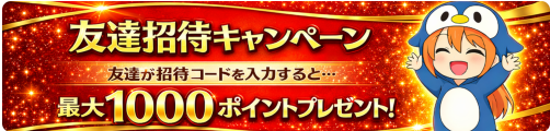 | 友達紹介 キャンペーン | 招待コードの入力で100ptもらえる |