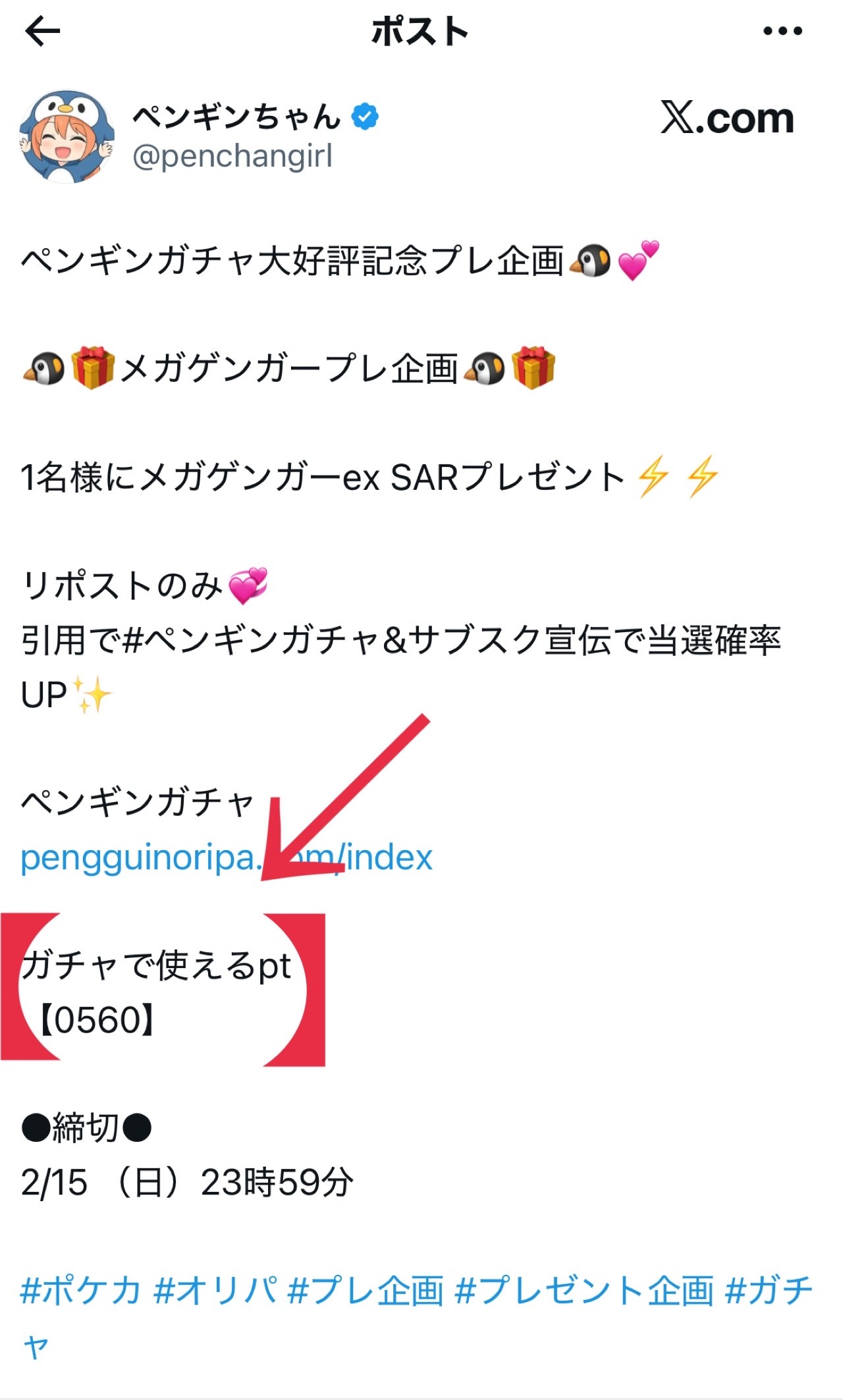 ペンギンガチャでは、X(旧Twitter)で当選報告をすると500ptもらえるキャンペーンを実施中!