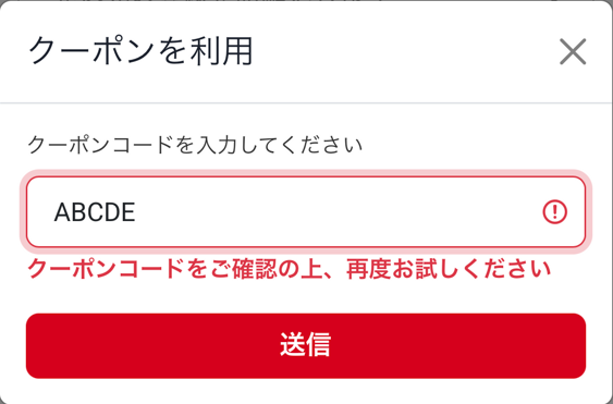 入力ミスをしているときは「クーポンコードをご確認の上、サイドお試しください」と表示されるので、もう一度クーポンコードを確認しましょう。