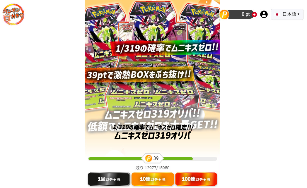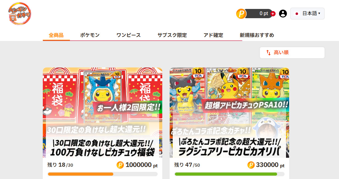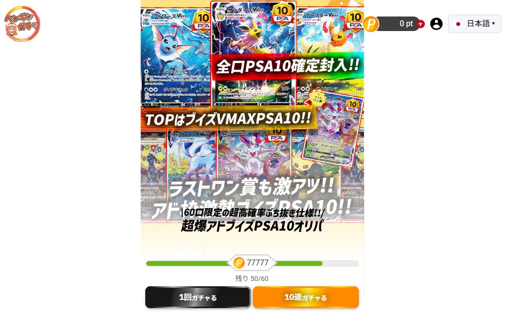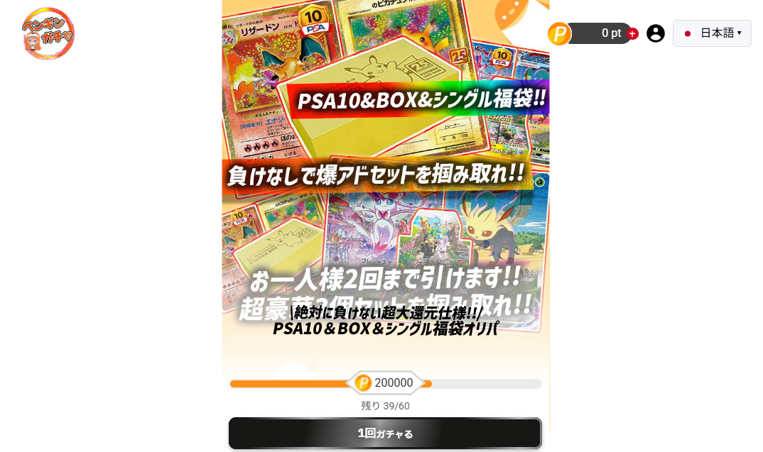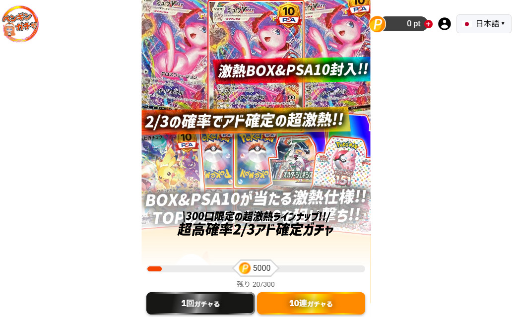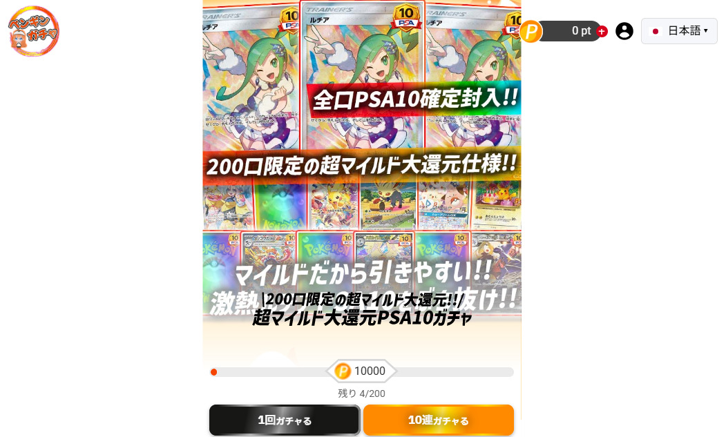 ペンギンガチャは高額ガチャでPSA10が確定するなど、しっかりとアドが取れる仕様です。