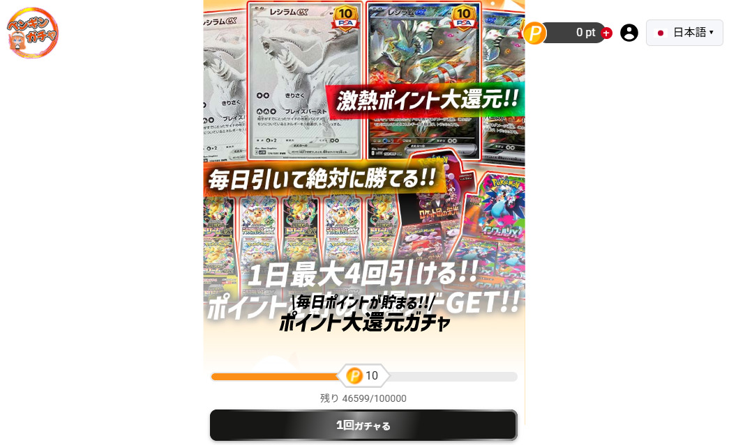 ペンギンガチャは、1日最大4回まで引けるポイント大還元ガチャを毎日開催しています。