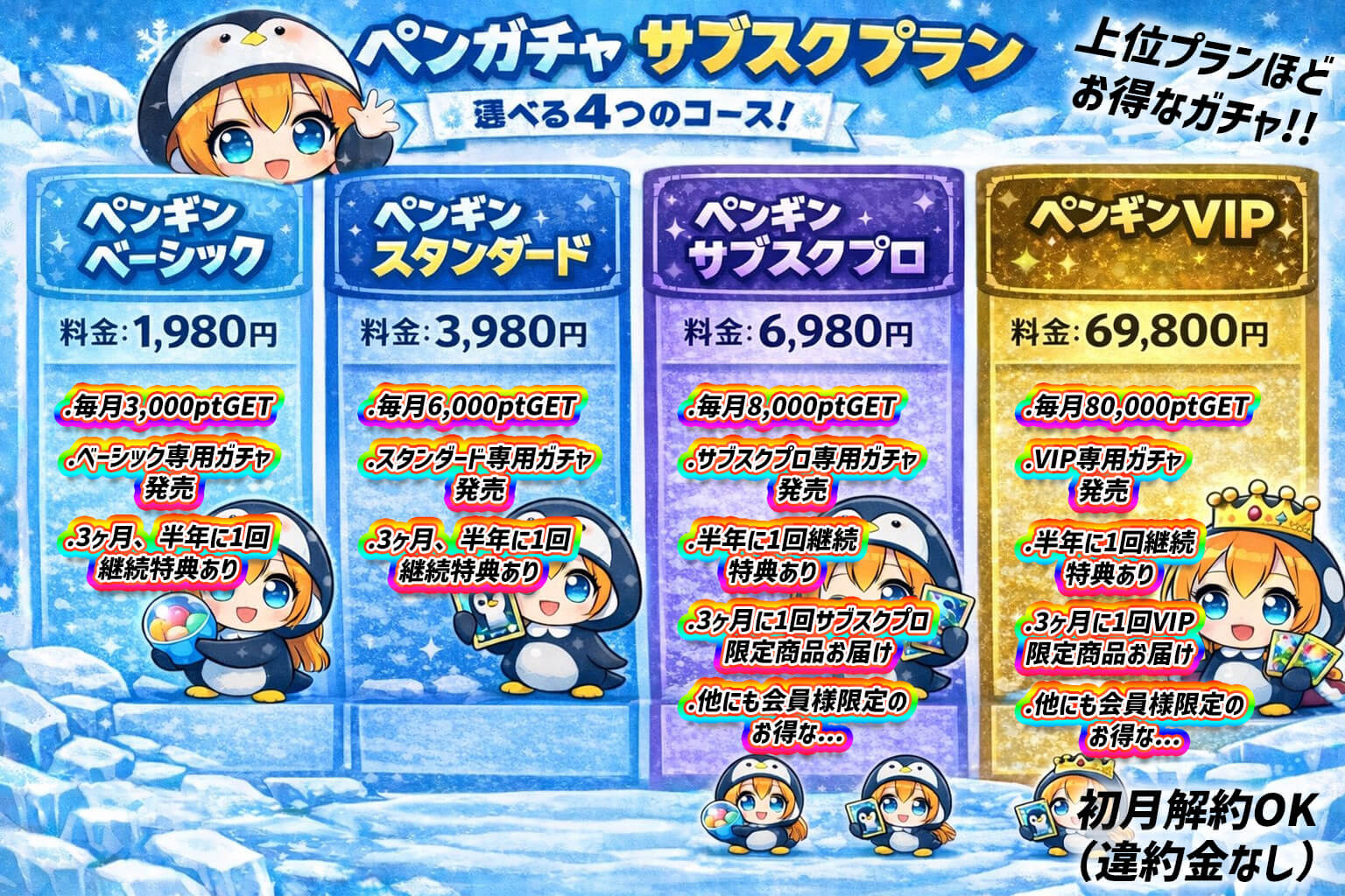 | ペンギンスタンダード | 3,980 円 | 毎月:6,000 pt付与 ベーシック、スタンダード会員限定ガチャが利用可 3ヶ月・半年ごとに継続特典あり |
