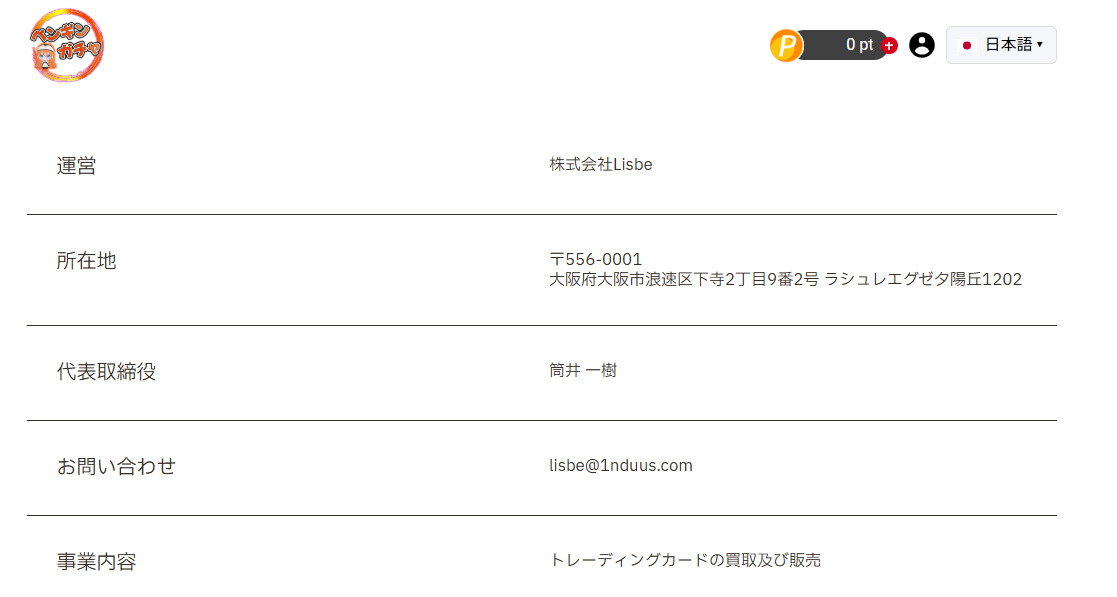 ペンギンガチャの公式サイト上には、運営会社や古物商許可証が記載されています。