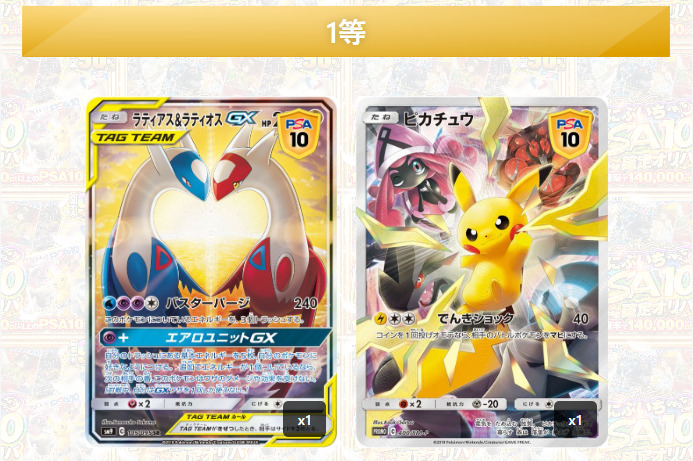| 封入カード | 1等:リザードンVMAX HR仕様プロモ(PSA10) 2賞:ピカチュウ 見返り美人(PSA10)、ミュウツー&ミュウGX SA(PSA10) |