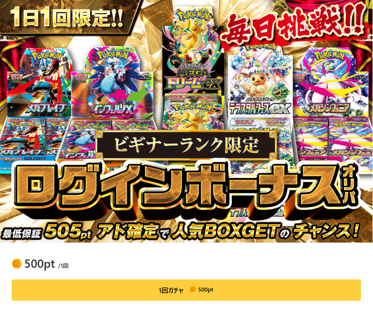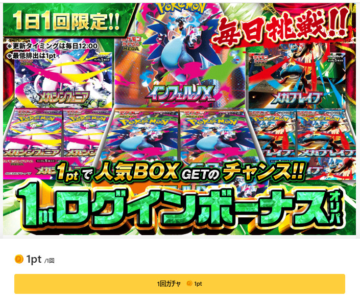 | 1ptログインボーナス オリパ | 拡張パックインフェルノX 1BOX(未開封) 拡張パックメガブレイブ 1BOX(未開封)) 拡張パックメガシンフォニア 1BOX(未開封) | 1pt | 無制限 |