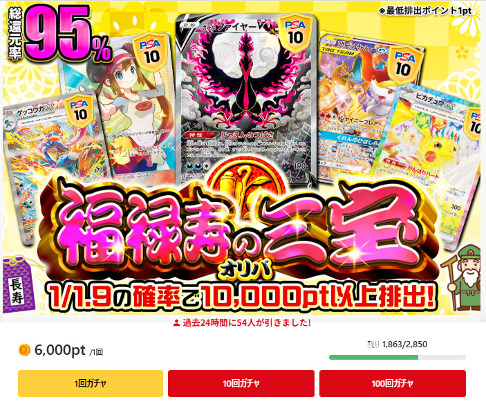 | 福禄寿の三宝オリパ | リザードン&テールナーGX SA(PSA10) メイ SR(PSA10) ピカチュウex 超伝ブレイカーSAR(PSA10) ガラルファイヤーV SR(PSA10) ゲッコウガex SAR(PSA10) | 6,000pt | 2,850口 |