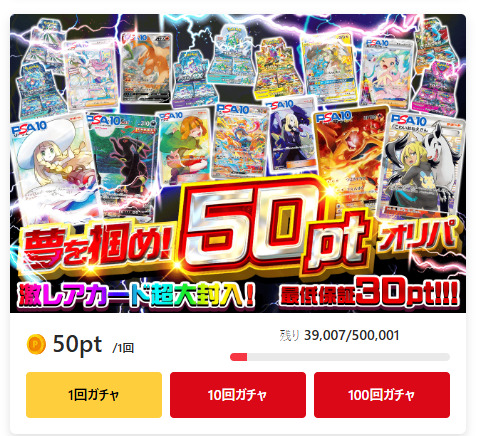 ログインボーナスのように1ptのオリパの開催は稀ですが、30~50ptのオリパは頻繁に販売されています。