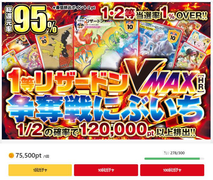 | 1等リザードンVMAX(HR) 争奪戦にぶいち | リザードンVMAX HR仕様プロモ(PSA10) | 75,500pt | 300口 |